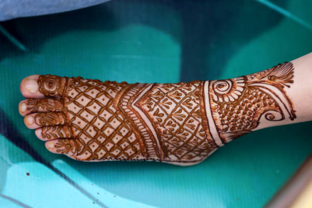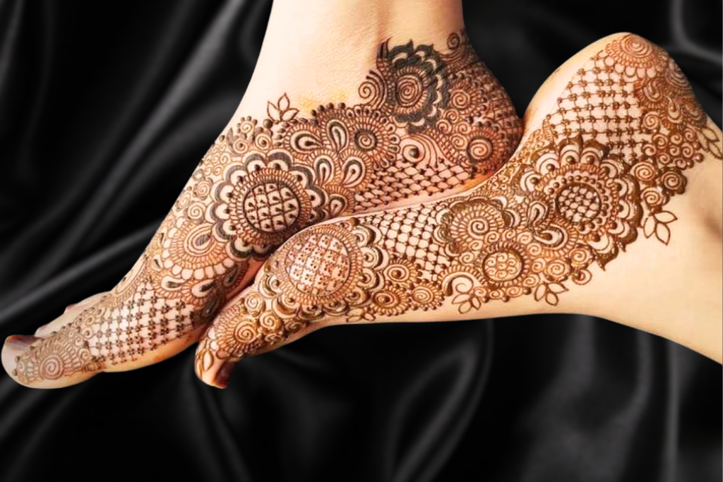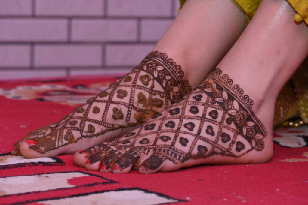 Net pattern designs of Mehendi for feet comprise cerebrally combined, lattice patterns like fairy decent meshes or jaali work. Those designs usually consist of geometric shapes, floral ornaments, and thin lines, and this way form a stylish openwork effect. Specially for festive events, they emphasize the feet with style and modern flair.