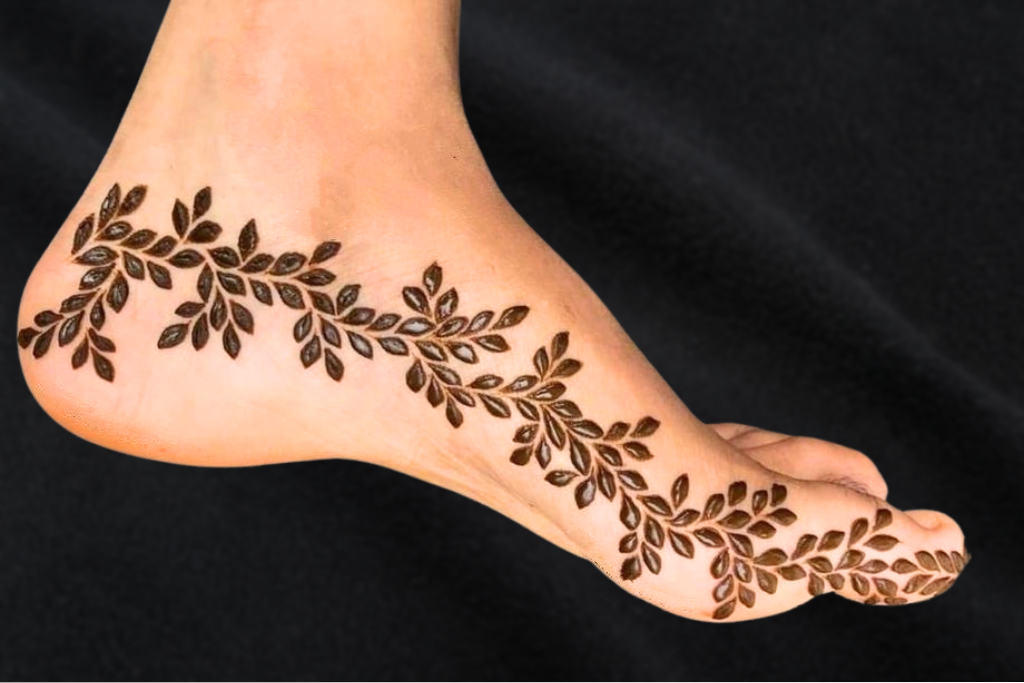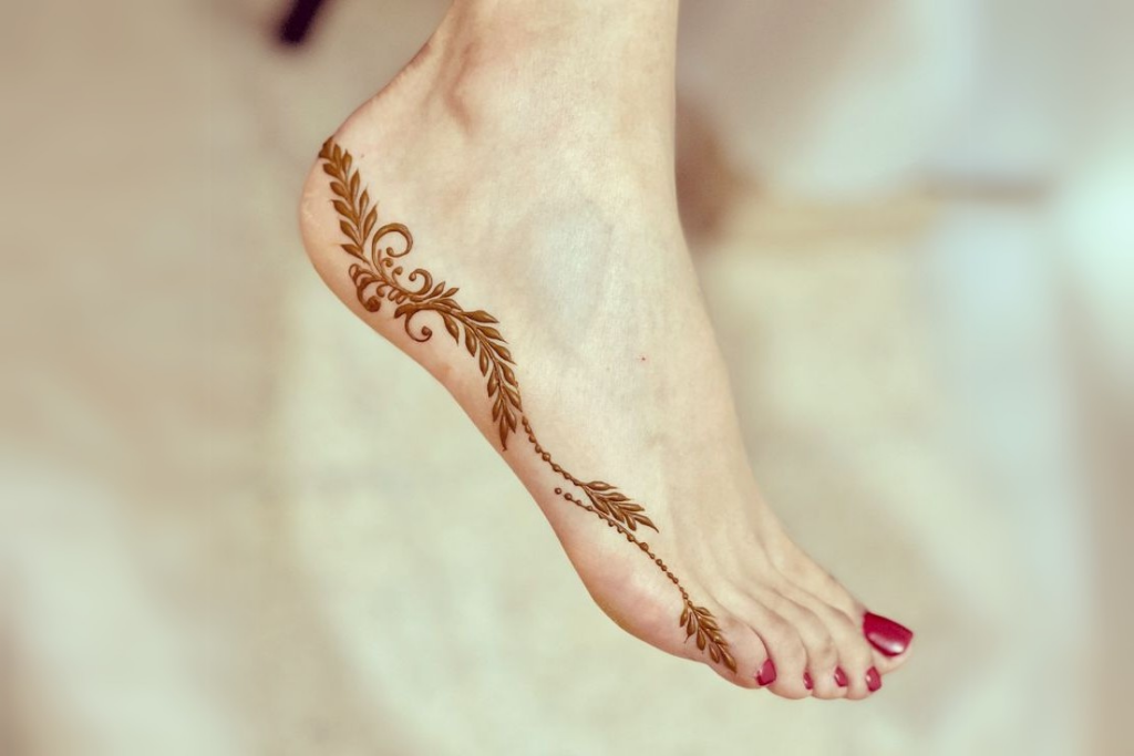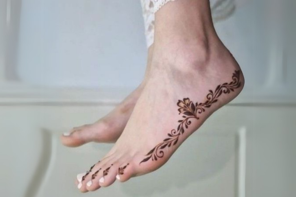 Grace Leaf Trail Mehendi is a modern elegant style which mentioned a waving vine of tender leaves and gentle curls. Leaving marks from the ankle to the toes, this foot minimalist design accentuates the foot’s natural curve to fit it to any occasion from modern events to casual and even bridesmaids who want to accentuate a subtle grace.