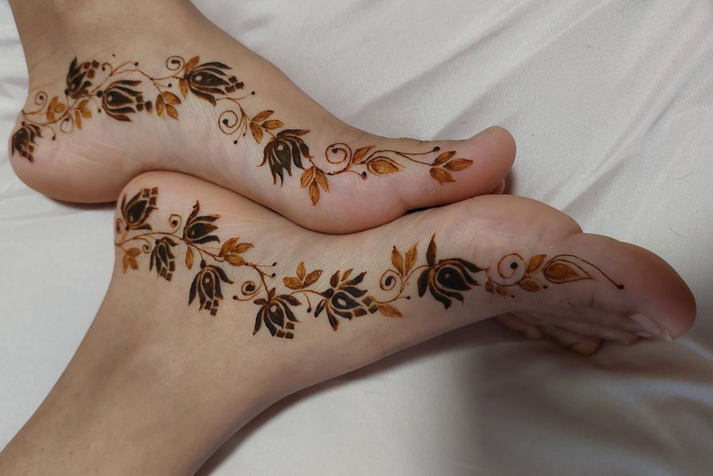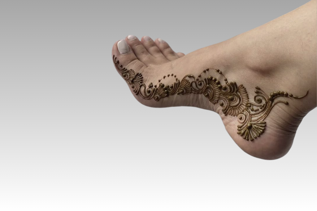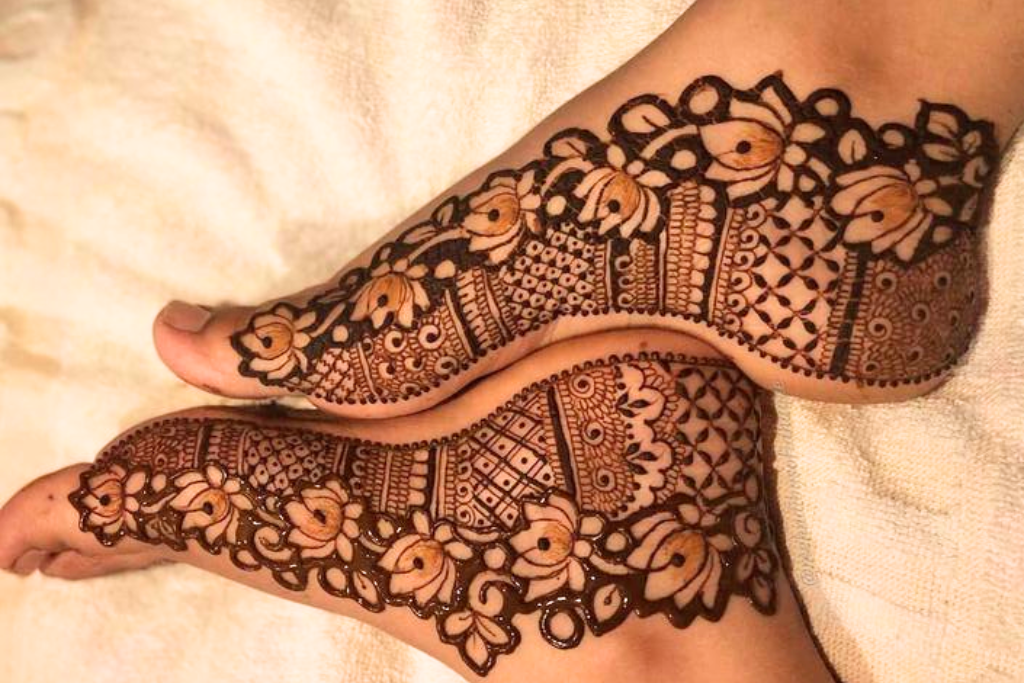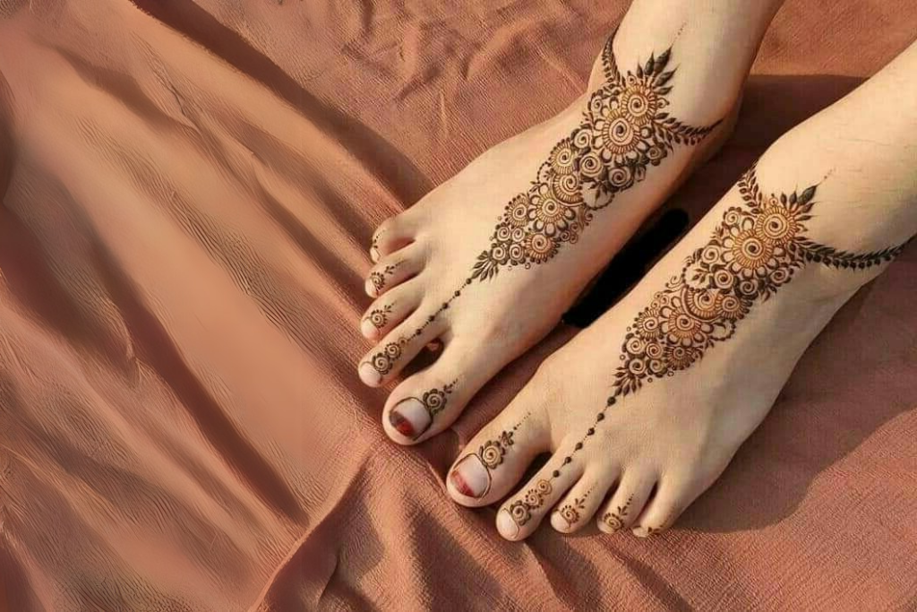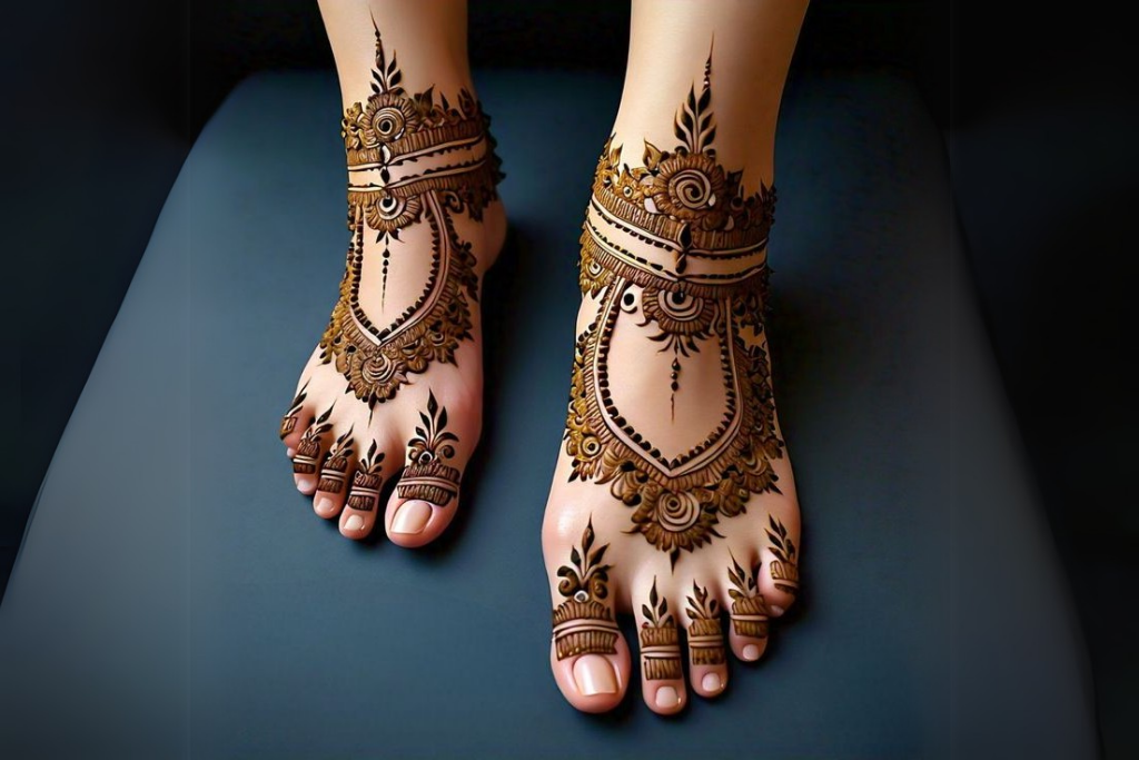 Royal Anklet Mehendi is an exquisite design which resembles the grace of the old jewelry with elaborate anklet pattern around the ankles and ornamental motifs drifting down the feet and toes. This design has a royal design and detailed with exquisite, giving an added majestic effect well suited for weddings and grand occasions.