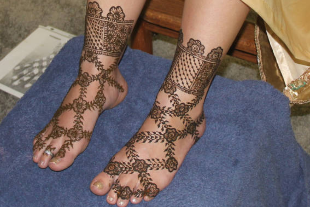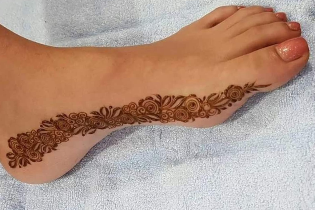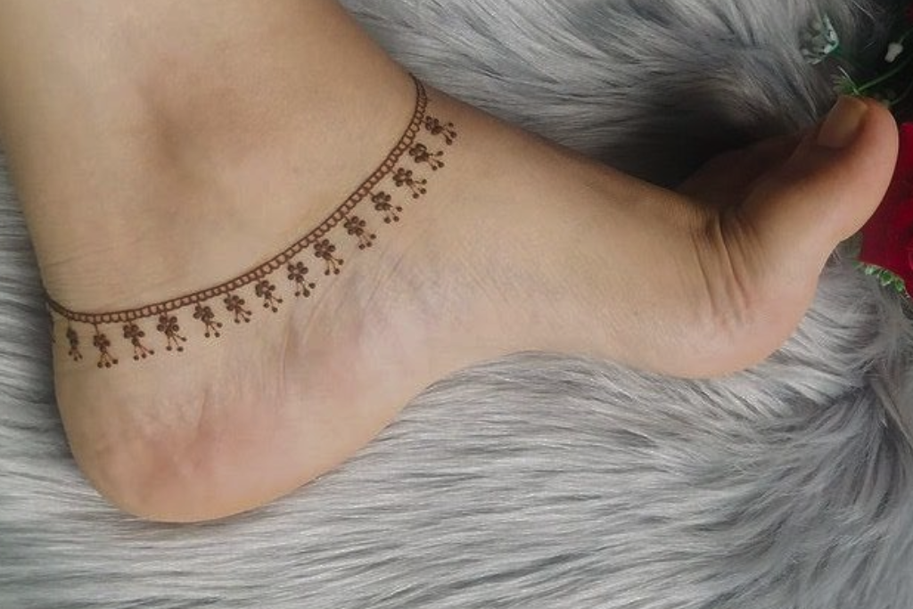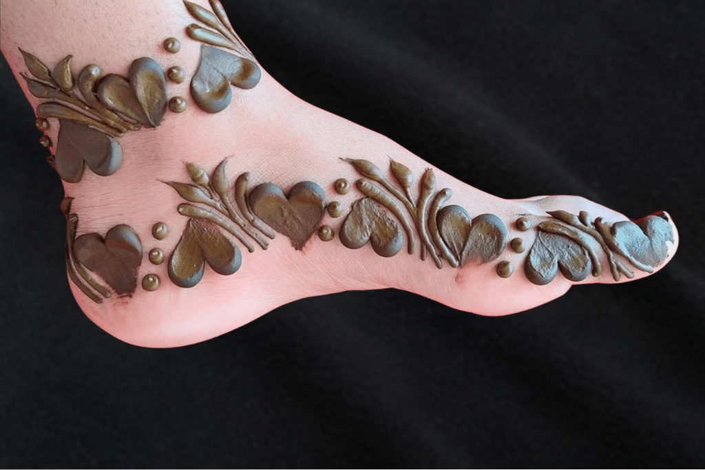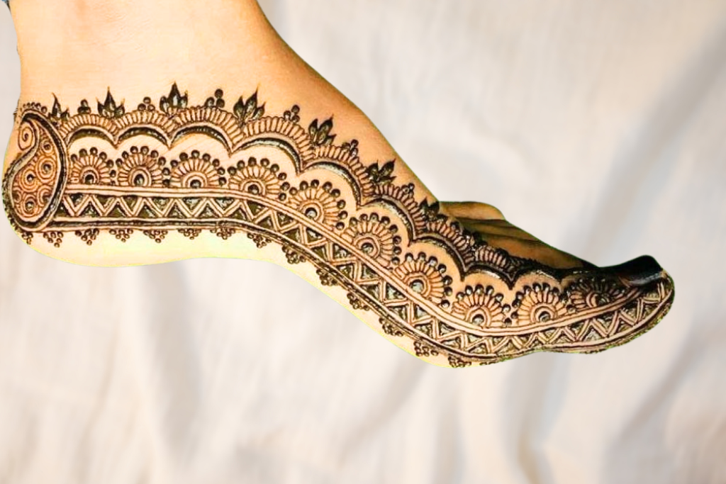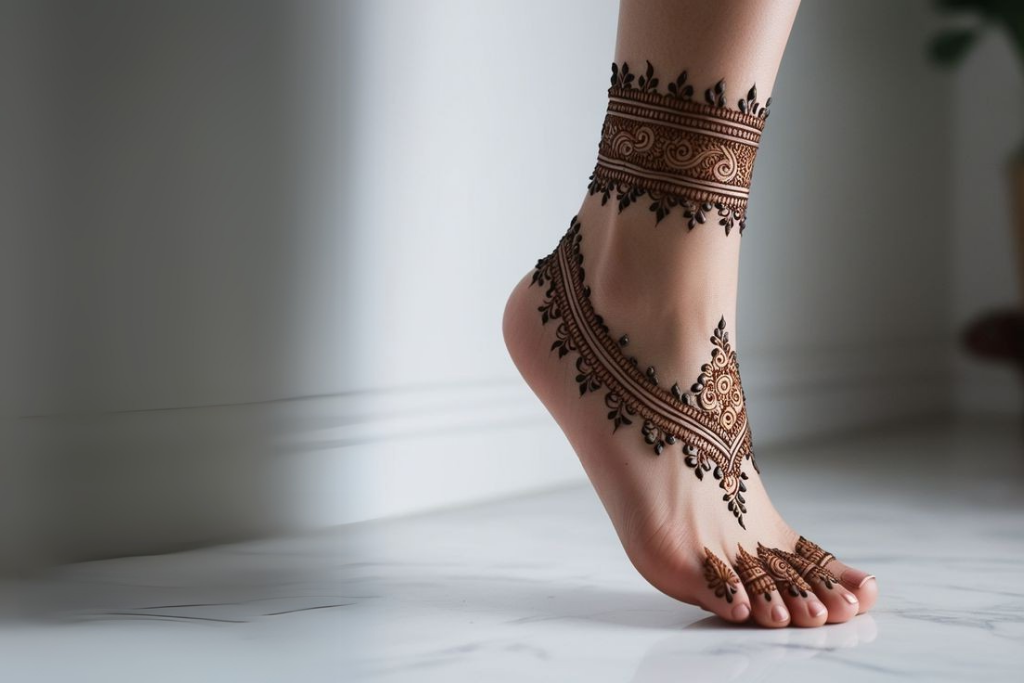 Royal Anklet Mehendi is an exquisite design which resembles the grace of the old jewelry with elaborate anklet pattern around the ankles and ornamental motifs drifting down the feet and toes. This design has a royal design and detailed with exquisite, giving an added majestic effect well suited for weddings and grand occasions.