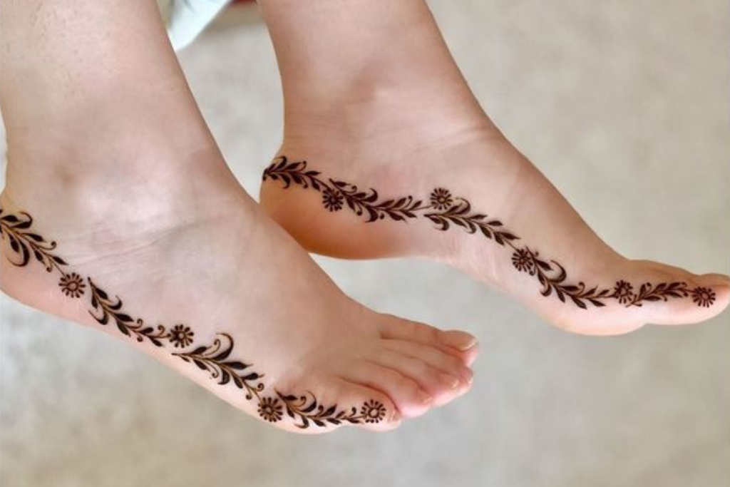 Minimalist Vine Mehendi Design is a classy tattoo design that has a continuous trail of romantic and thin leaves that gently surrounds the side of the foot. Hi there giving a clean and natural definition to this design, it has a great combination of simplicity and attitude, bringing to the fore, those people who enjoy understated beauty.